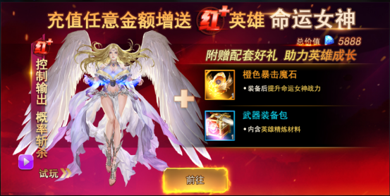 首充任意金额可得红+英雄命运女神、橙色暴击魔石与武器装备包