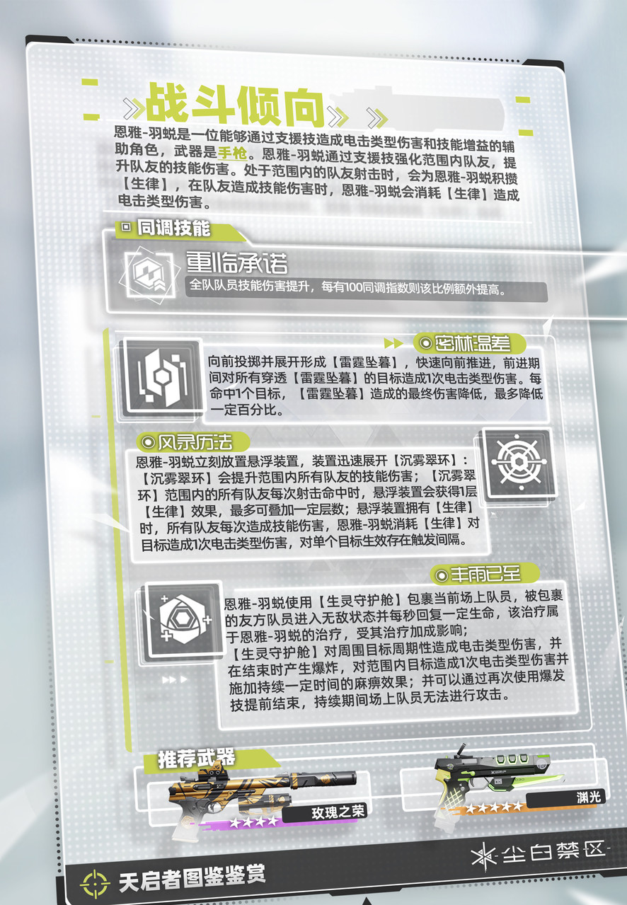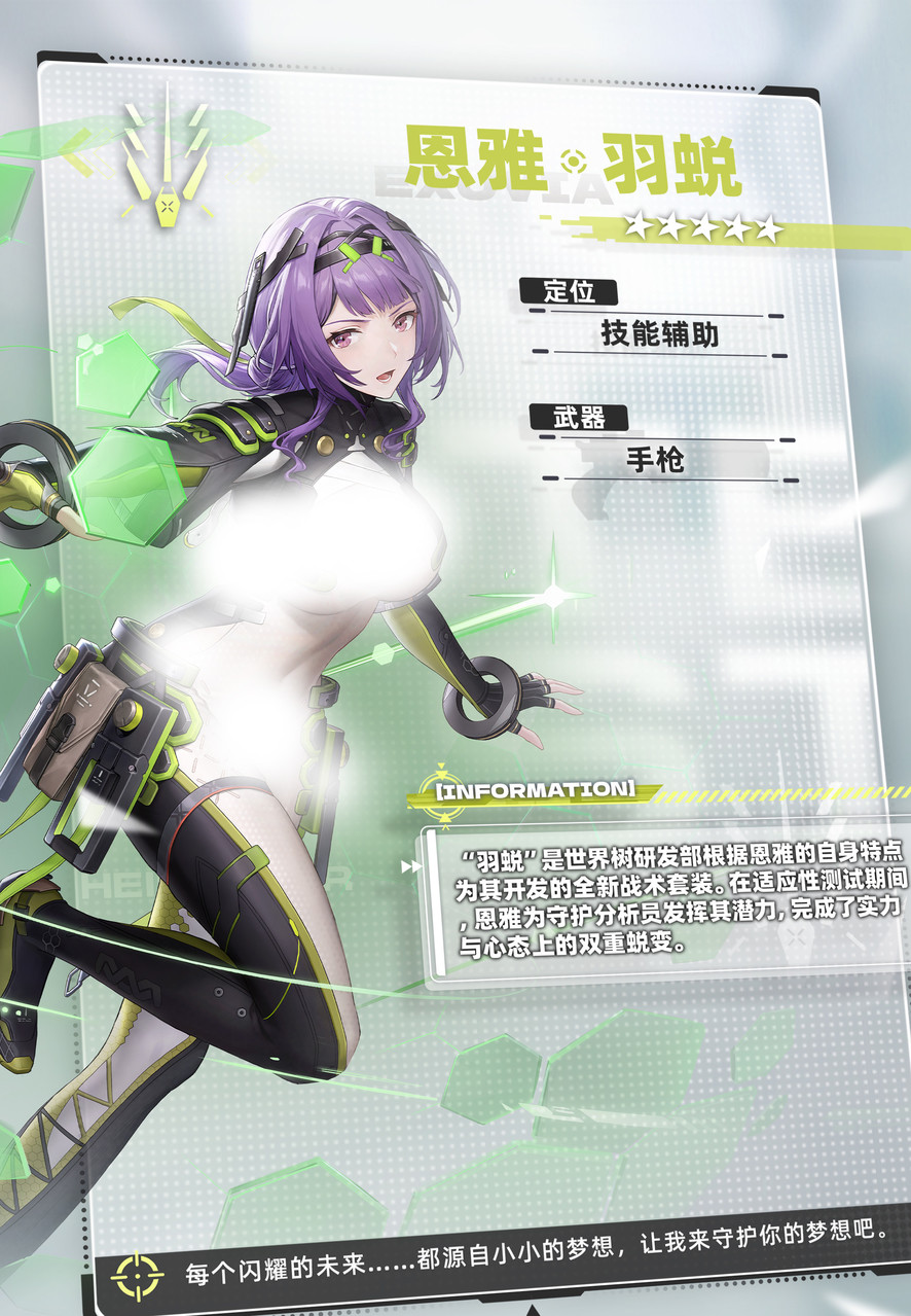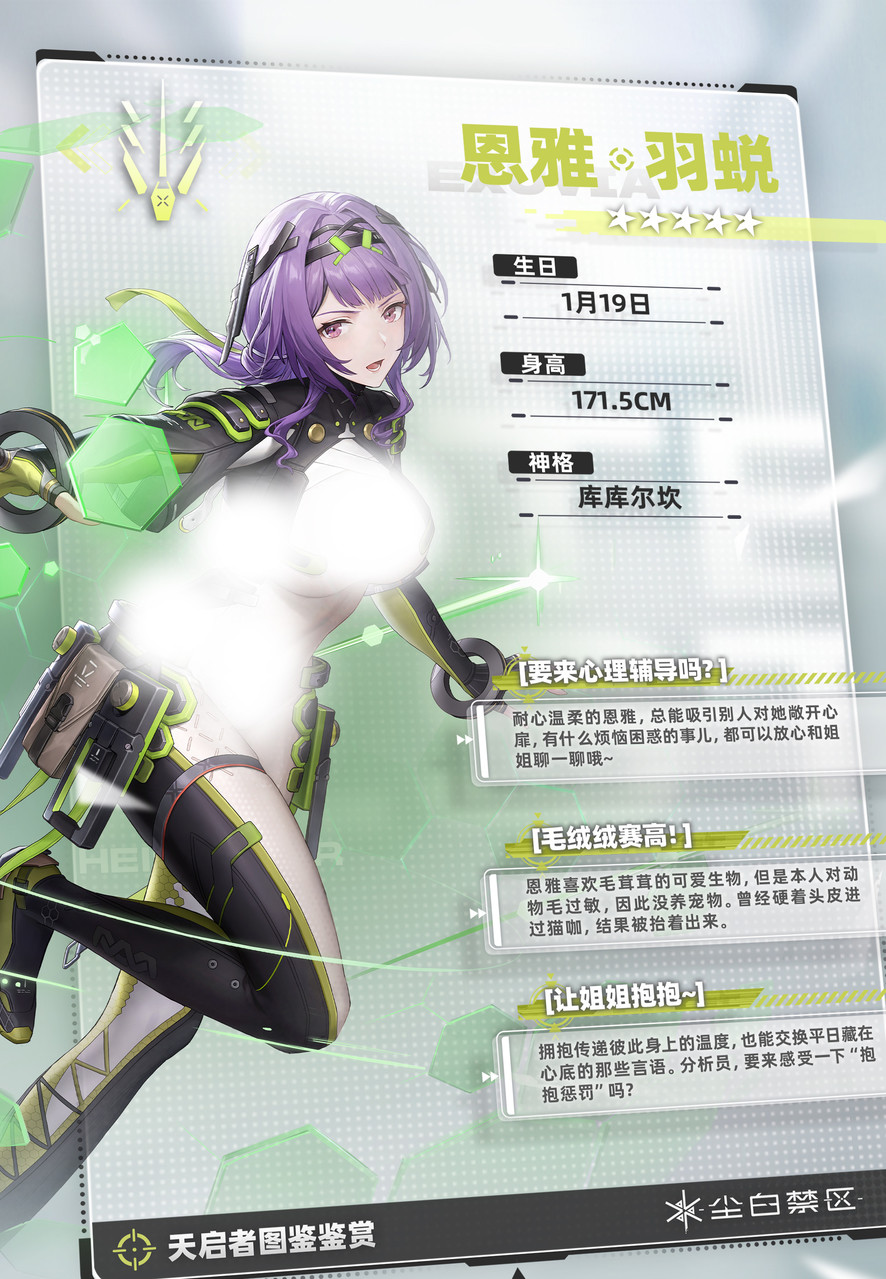 《尘白禁区》「天启者图鉴鉴赏 | 恩雅-羽蜕」《尘白禁区》制作组发布于 2024-04-30恩雅-羽蜕 Exuvia"羽蜕"是世界树研发部根据恩雅的自身特点为其开发的全新战术套装。在适应性测试期间,恩雅为守护分析员发挥其潜力,完成了实力与心态上的双重蜕变。