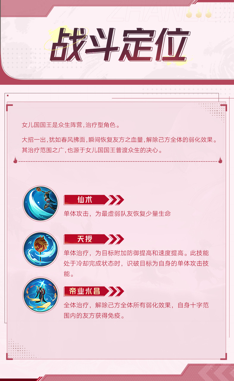 《西游:笔绘西行》出场角色|“受命神山,帝业永昌!”玉小兔发布于 2024-05-11“受命神山,帝业永昌!”>>出场角色|女儿国国王 百年前,唐僧师徒一行途经女儿国,女儿国国王心生倾慕之情,欲以一国财力为聘,邀其共结连理。然而,唐僧一心向西,不受红尘所动,乃施计骗得女王送他出城。女儿国国王深知此去无回,心中五味杂陈,只得怅然若失地回归寝宫。机缘巧合之下,得遇玉面狐狸相救。两人一见如故,义结金兰,更邀玉面狐狸担任国师之职,共商国是,携手治理女儿国。>>国漫战斗动画>>战斗定位