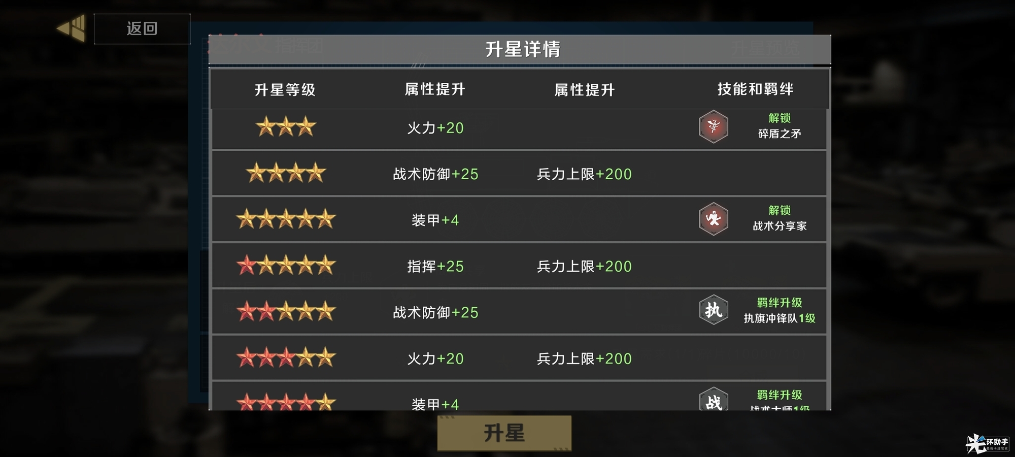 升星后不仅能提升部队属性、兵力上限。部分星级还将解锁部队技能、提升羁绊等级。