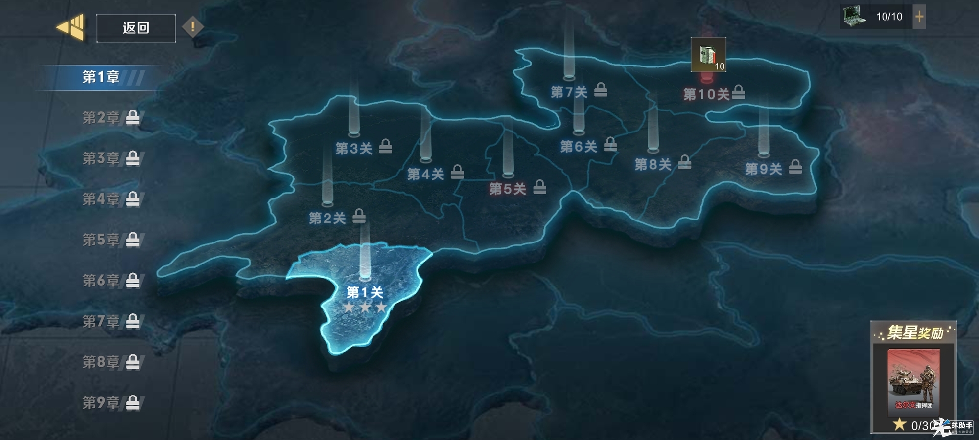 每章完成【10星、20星、30星】都有阶段奖励。首战可无限次挑战,扫荡和补星消耗消耗道具,道具通过钻石可购买。