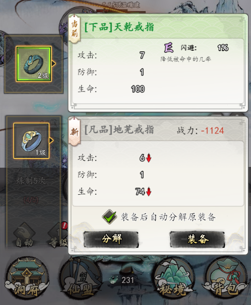 刚进入游戏根据指引完成灵炉炼制,并且装备上炼制出的装备(装备品质分为:凡品、下品、中品、上品、极品、仙品、完美、先天、至宝(越往后品质越好)。在炼制时可以根据图上的箭头标识,来选择装备还是选择原有的装备(PS:选择后另外一个会进行分解)。