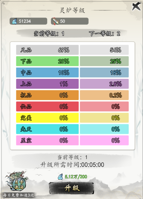 而装备也分为不同的品质,更推荐玩家在前期将一定的资源(建议可以投入一半左右的资源)先投入灵炉等级进行升级,灵炉等级越高可以产出的装备品质也就越好,获取更好装备的品质概率也会提高。(玩家还可以在睡觉前让灵炉进入升级状态,最大化利用资源)