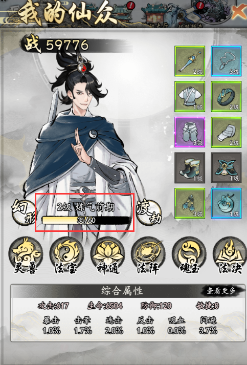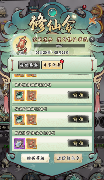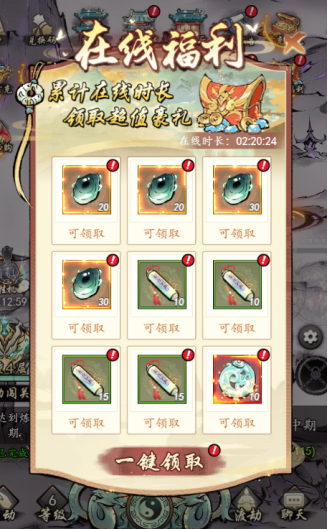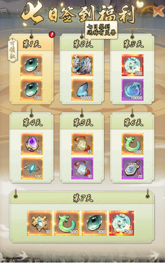 1.在线奖励(领取基础材料资源)、修仙令(可以进阶等级)、七日登录(领取鹏鲲、玉匣)等