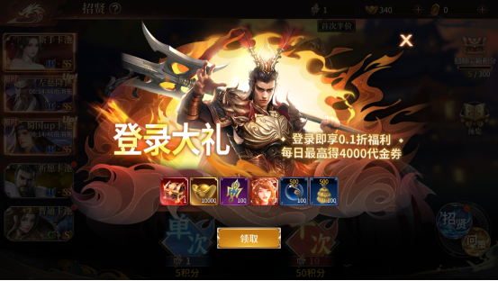 新手关卡打完 赠送 登陆豪礼宝箱*1、黄金*1w、普通招贤券*100、甄姬*1、中品经验丹*500、中品马粮*500