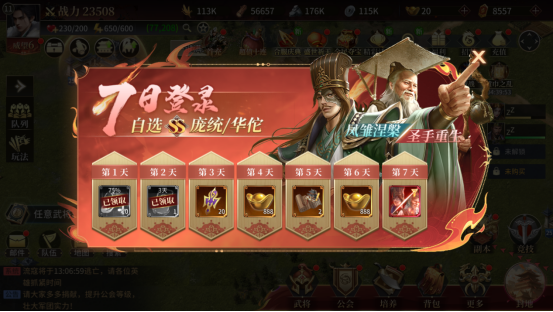 新手七日签到还可以获得丰厚奖励,玩家可以自选强力SS角色庞统或华佗
