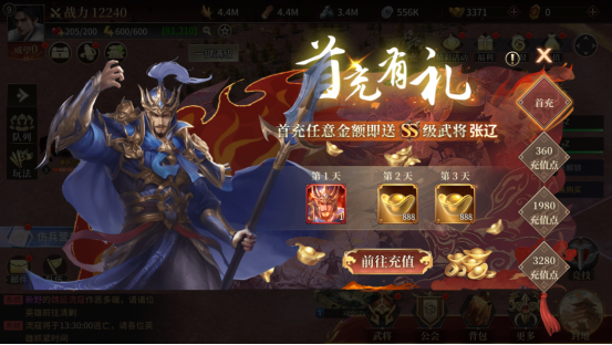 首充礼包的性价比较高,推荐有能力的玩家购买,获得SS级武将张辽,可以极大改善游戏体验。