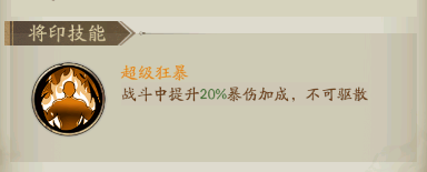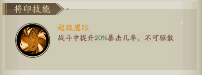 暴击将印 主力输出必备技能 最高20的暴击几率,现在游戏满爆很困难,去除一些天生自带暴击的(如关羽,赵云)其他人想满爆很困难基本必带鹰眼和蔡文姬,蔡文姬带15%,军团技能带20%,加上鹰眼带20%,这加起来有55点,勉强够用了。剩下的想满爆就得靠兵法来堆,而且这个技能只在将印上,虎符上没有。