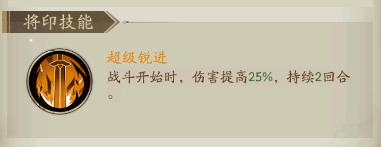 锐进是增伤最多的伤害而且和物伤法伤以及穿透全都不冲突(不同名之间的伤害提升都是乘算的)也就是这里稳定提升25%的输出 对于第二回合打输出的武将简直就是神级 当然缺点也很明显 就是只增加2回合 没有持续性
