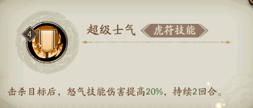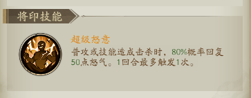 如果说有什么技能输出都能带的话 那一定也是这个了怒意,我们的游戏机制 回合结束恢复50怒气,放完大招后 正常要两回合也就是第五回合才能再放第二次大招,怒意能让我们的大招频率变得更丝滑,毕竟多放一次大招就意味着更多的伤害,更适合一些会多动的武将