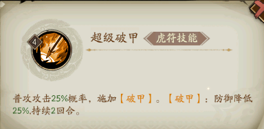 少数几个个人觉得没什么用的技能 只有普攻有几率 增加一个破甲buff 其实防御本身都不算高所以破防本来就是收益很低的一个伤害系数 再加上只有普攻能触发 而普攻能打多个目标的 也就只有张角和华雄 张角其他单位是溅射伤害不触发 只有华雄有概率触发 或者可以给奶妈带上偶尔普攻帮一个单位降降防御 聊胜于无