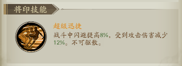 又是一个肉系神技之一,闪避和稳定减伤,后期搭配兵法 闪避会特别的高 一般很少会有人带命中,而且加命中的东西又很少。所以这个技能在后期就是个bug一般的存在,但本身不适合需要受到伤害才触发的人,比如郭嘉和神关和典韦