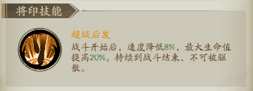 这个技能机制是降速变肉,可以考虑给奶妈 也可以考虑给部分输出,由于游戏机制,想要第一回合就放大招 必须放在承伤位 让对面5个人都打你 才能满怒气 放出来大招,这个技能就很适合需要第一回合就放大招的,但是本身也不算脆的武将 或者奶