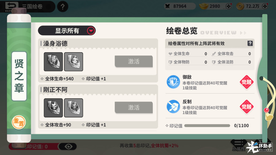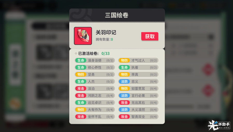 玩家通过收集武将的印记来点亮三国绘卷,每一章三国绘卷进度值达到一定值,可以觉醒技能,技能为战斗提供极大的帮助