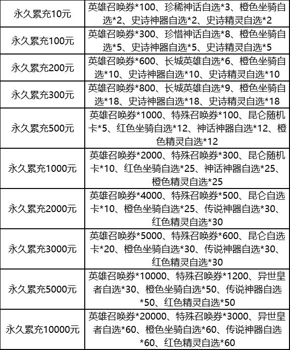 累充3000元 异世皇者指定卡*10、英雄召唤券*10000,星光晶体*200000,魔力之星*10000,赋能石*1000000、圣物晶石*10000000、神陨星石*100000、沃坎碎片*100000、神奇羽毛*10000