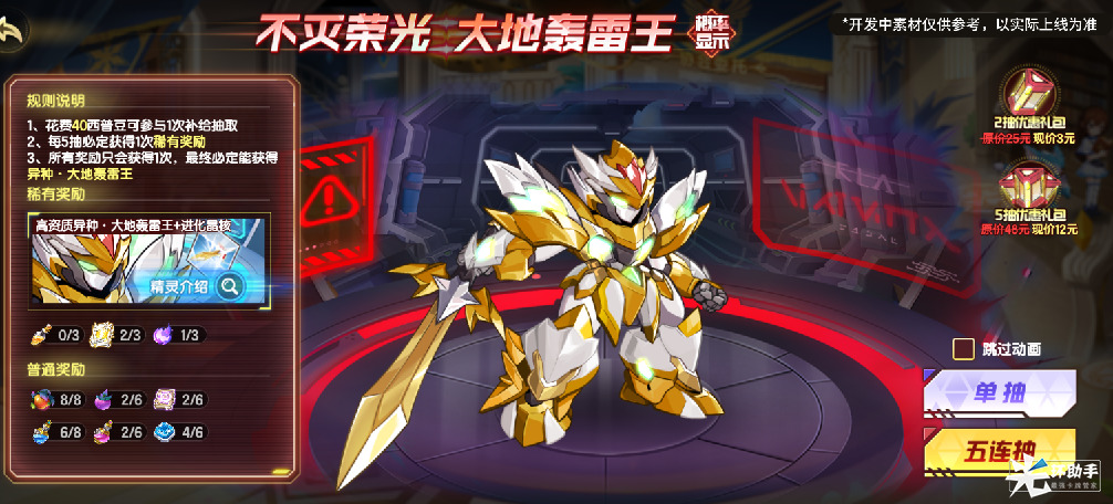 玩法说明:通过参与拯救大地、超能骇客、大地武装等玩法活动,获得精灵大地王以及大地轰雷王进化晶核等对应的奖励。