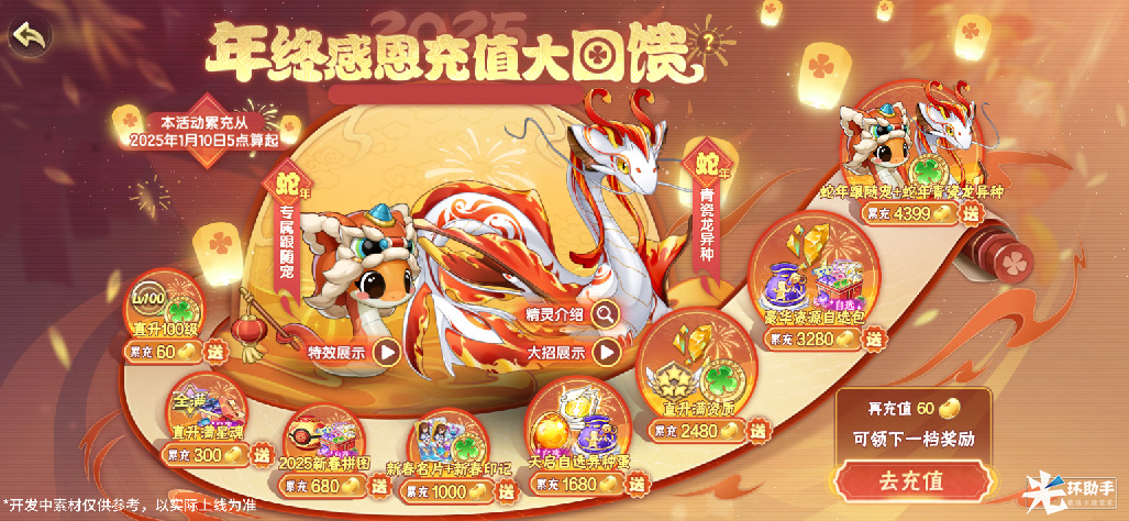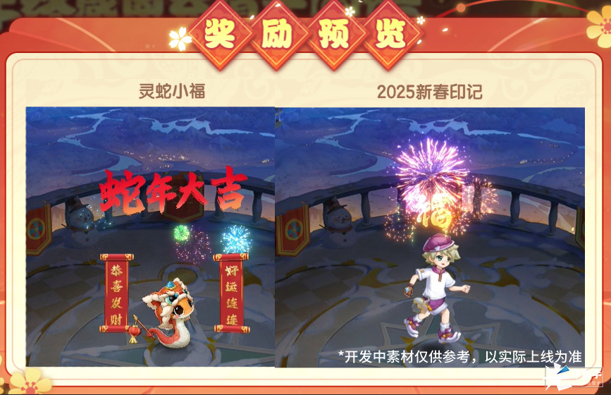 活动奖励:蛇年专属跟随部件、蛇年特殊精灵青瓷龙、新春拼图、新春名片、新春印记等