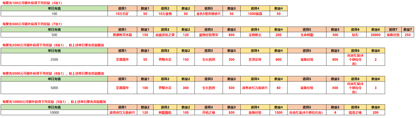 ——单日每累计充值100元、500元、2500元、5000元、10000元,即可获取下列任意一个道具内容