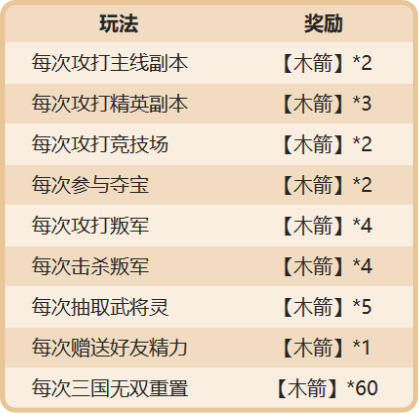 2.活动期间参与游戏内部分玩法,可获得【木箭】,获取方式及数量如下: