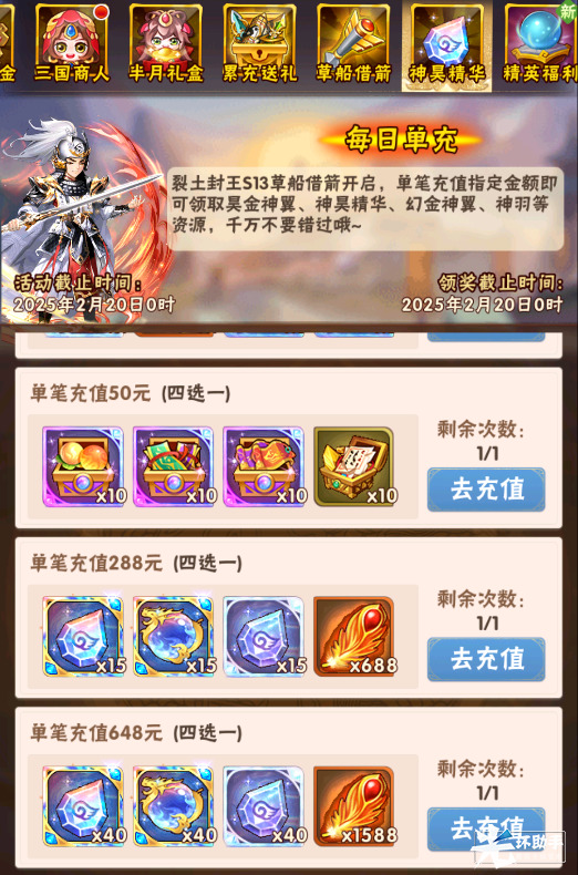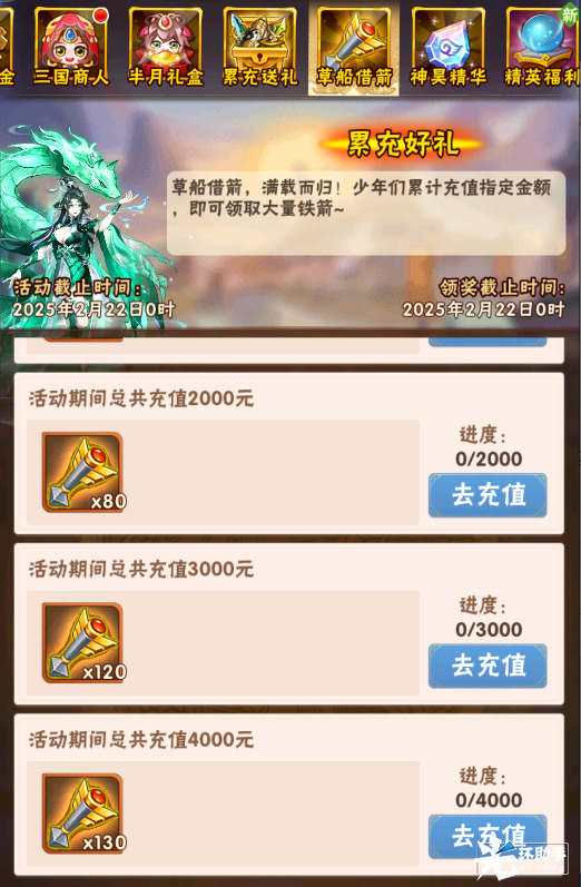少年们单笔充值指定金额,即可得到昊金翅膀精华、神昊精华、幻金翅膀精华、神羽等珍稀道具!并且还可以获得铁箭,在草船借箭活动中进行兑换!