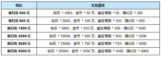 1、玩家单日充值礼包,指统计玩家单日内的充值额度,次日按最高一档手动发放,不能累加领取