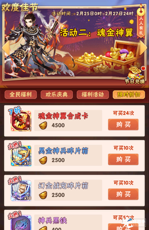 初春欢庆折扣商店限时促销,折扣低至2折,用元宝就能购买大量稀缺资源!快来选购吧。