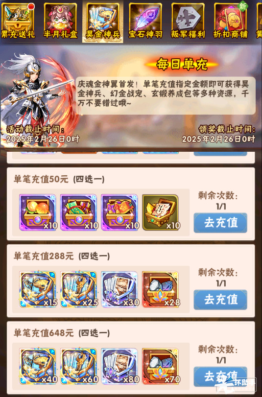 少年们单笔充值指定金额,即可得到铜雀银鲨碎片箱、昊金神兵四选一、幻金战宠碎片箱、玄锻养成包等珍稀道具!并且可以和初春欢庆中的充值活动叠加,千万不要错过哟~