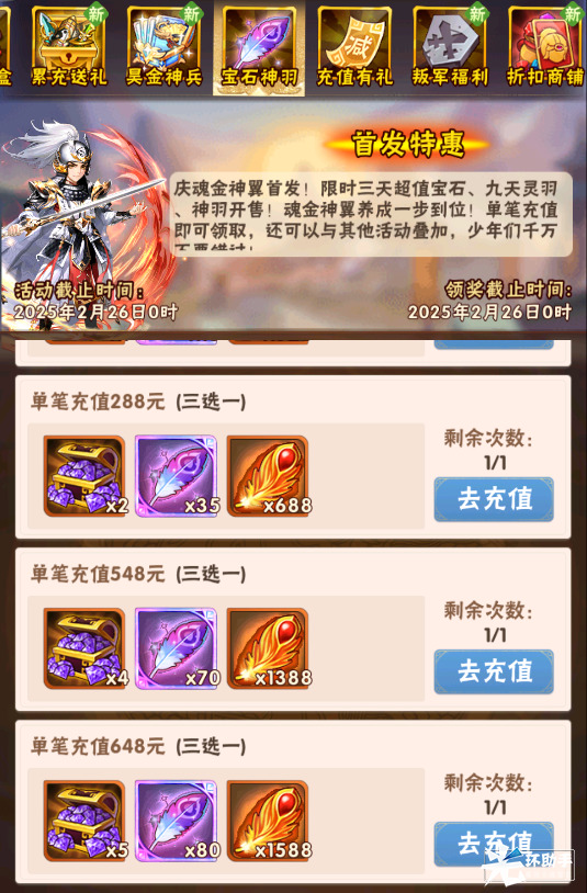庆魂金神翼首发!限时三天超值宝石、九天灵羽、神羽开售!魂金神翼养成一步到位!单笔充值即可领取,还可以与其他活动叠加,少年们千万不要错过!