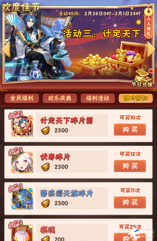 初春欢庆折扣商店限时促销,折扣低至2折,用元宝就能购买大量稀缺资源!快来选购吧。