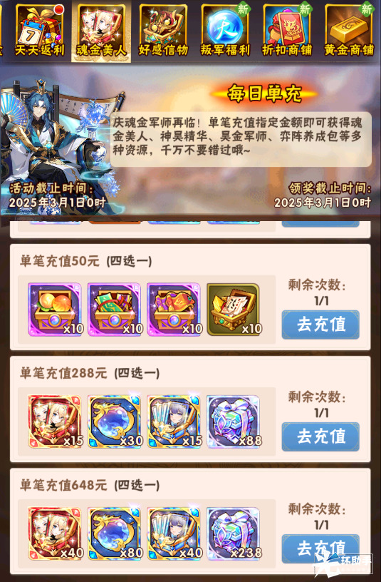 少年们单笔充值指定金额,即可得到魂金美人二选一、神昊精华、昊金军师碎片箱、弈阵养成包等珍稀道具!并且可以和初春欢庆中的充值活动叠加,千万不要错过哟~