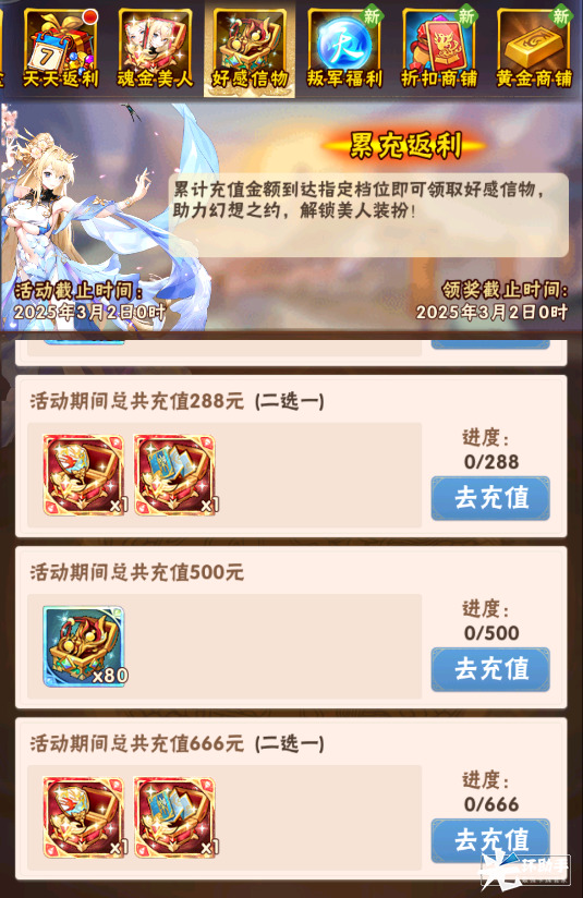 累计充值金额到达指定档位即可领取好感信物,助力幻想之约,解锁美人装扮!