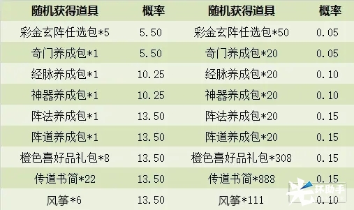 3.「初春礼盒」可开出:风筝*111、彩金玄阵任选包*50、奇门养成包*20、经脉养成包*20、神器养成包*20、阵法养成包*20、阵道养成包*20、橙色喜好品礼包*308、传道书简*888、风筝*6、彩金玄阵任选包*5、奇门养成包*1、经脉养成包1、神器养成包*1、阵法养成包*1、阵道养成包*1、橙色喜好品礼包*8、传道书简*22中的随机1种。