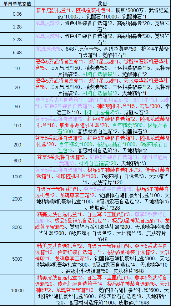 3、奖励将于达到相应单笔金额后,在对应充值的角色内进行通过邮件发放;
