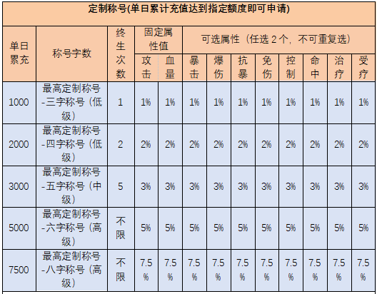 如果玩家当日累充10000元,可以选择2次定制称号,称号字数由玩家自行选择(最低不可以超过六字)