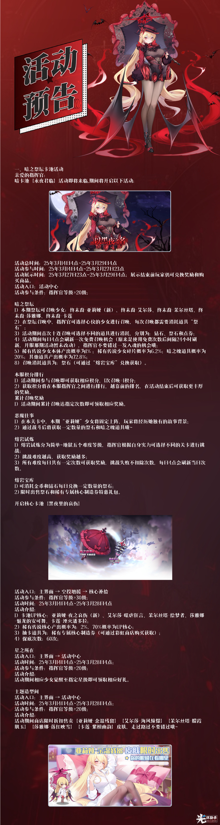 新角色终末裔亚莉娅即将登陆绿洲,暗之祭坛限时开启,花嫁誓约活动限时返场,婚纱皮肤免费四选一。