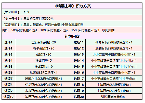 单日实付500元 :未来召唤SSR特权自选箱×1;神器密卷×10;体力药水×400