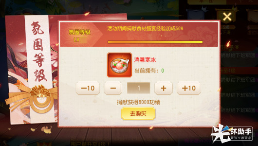 饕餮盛宴热闹不可少,小乔作为气氛组必须到位。氛围道具助力主公盛宴等级再上一层楼,主公捐献[消暑寒冰]可以提升氛围等级,捐献甜蜜果酱、缤纷棉花糖即可获得经验加成,最高可达50%!10级不是梦,快和小伙伴一起参与吧。