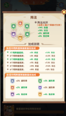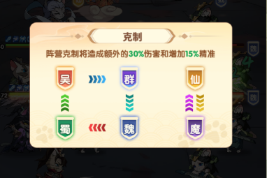 阵法:上满6个武将会自动生效法阵,队伍中同阵营武将数量会影响血量和攻击加成,同阵营数量越多,提升越大;同时6个阵营中同阵营武将数量还会提供不同的属性减免:魏——每个+2%减伤率,蜀——每个+2%减伤率,吴——每个+2%减伤率,群——每个+2%减伤率,魔——每个+4%免控率,仙——每个+4%免控率。