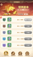 日常副本根据资源做了四个分类:银两副本、进阶副本、武将副本、兵符副本。对应的副本可以产出相应的资源用于养成(每种副本每天有两次挑战次数,失败不扣除剩余次数,挑战次数随着VIP等级可以额外购买)。