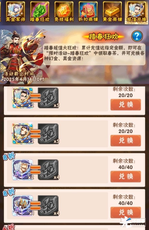 踏春欢庆折扣商店限时促销,折扣低至2折,用元宝就能购买大量稀缺资源!快来选购吧。