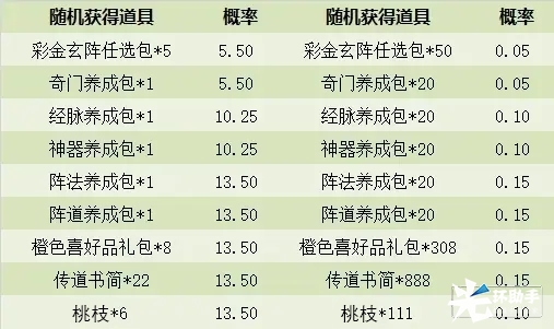 3.「踏春礼盒」可开出:桃枝*111、彩金玄阵任选包*50、奇门养成包*20、经脉养成包*20、神器养成包*20、阵法养成包*20、阵道养成包*20、橙色喜好品礼包*308、传道书简*888、桃枝*6、彩金玄阵任选包*5、奇门养成包*1、经脉养成包1、神器养成包*1、阵法养成包*1、阵道养成包*1、橙色喜好品礼包*8、传道书简*22中的随机1种。