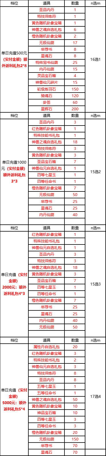 历史累充(折后)20000元:金子*200000、神兽仙元*4、珍稀材料自选礼包1*100