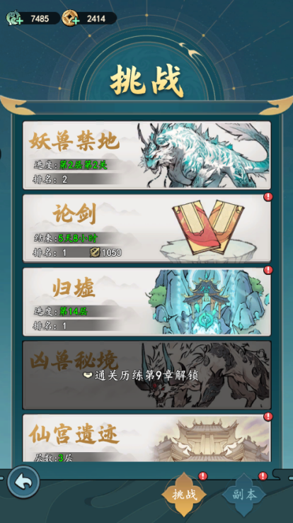 主界面右下角征战功能还有妖兽禁地、论剑、归墟、凶兽秘境、仙宫遗迹可以获得丰厚奖励