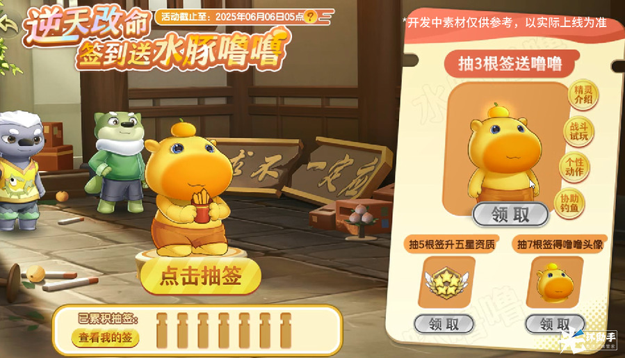 打工是不可能打工的,全看我们噜噜抽签逆天改命(´▽`)七日签到开启,累计签到抽取三根签即可获得可爱的精灵·水豚噜噜,累计签到五天可将精灵·水豚噜噜直升至五星资质,累计签到七天可获得联动精灵纪念头像!