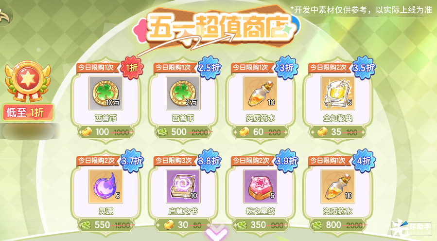 五一超值商店开启!每日都可抽取折扣徽章,将随机获得道具最低1折的优惠折扣。小西普可以在商店内以折扣价购买需要的培养礼包,不同道具会有不同的折扣优惠,更有惊喜的1折道具哦!部分礼包支持点券购买,机不可失哦!