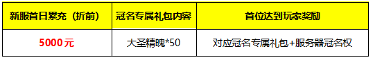 (1)新区开服首日达到额度,即可获取【冠名专属礼包】奖励,首位玩家可以获得服务器冠名权,其余玩家可获得冠名礼包*1