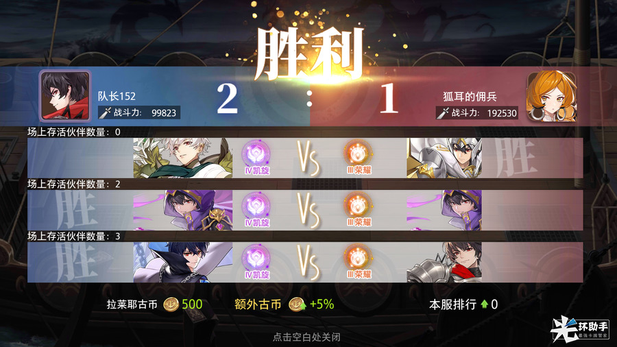 战斗结束后存活的伙伴越多(不包括队长和召唤物),可赢得的额外古币越多,单次比赛最多可获得15%的额外古币;