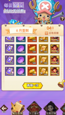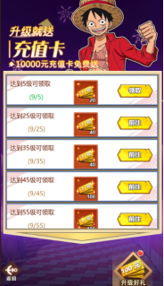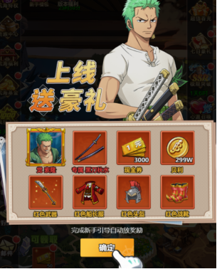 5、梦幻开局,创角送索隆与佩刀秋水。更有3000元充值卡获得,使用后,VIP等级立即提升至V5