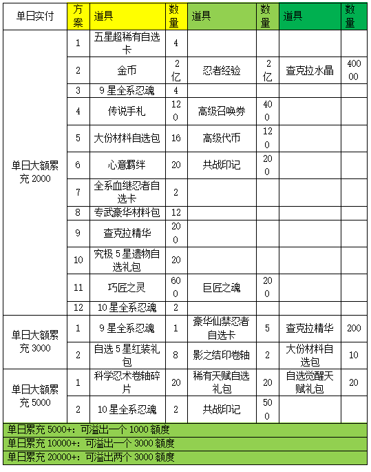 终生累充3000元:9星全系忍魂*1、橙神器碎片自选C*100、查克拉精华*80