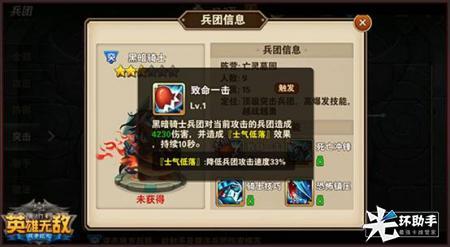 单一的削减性技能,一旦被黑暗骑士所攻击,将产生士气低落的技能效果,从而减去敌方兵团的攻击速度。虽然从技能上来看,增幅范围比较单一,但是从效果上来看,可以说是非常显著的。因为黑暗骑士在目前的游戏版本中,可以说是突进能力最强的作战兵团,搭配上这样的技能效果,能够提升他突破速度,提升对敌方兵团的威胁。